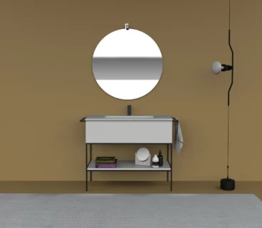 Struttura in finitura metallo nero e mobile con cassetto in finitura nobilitata Bianco opaco. Lavabo integrato in ceramica.